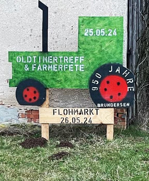 Das erste Schild informiert bereits über das Highlight in Bründersen am 25.05.2024: die Oldtimer Ausstellung, gefolgt von der Farmerparty im Lehmloch am Abend. Doch das ist noch nicht alles! Am 26.05.2024 findet außerdem der Dorfflohmarkt statt, der Bewohner und Besucher gleichermaßen begeistern wird.